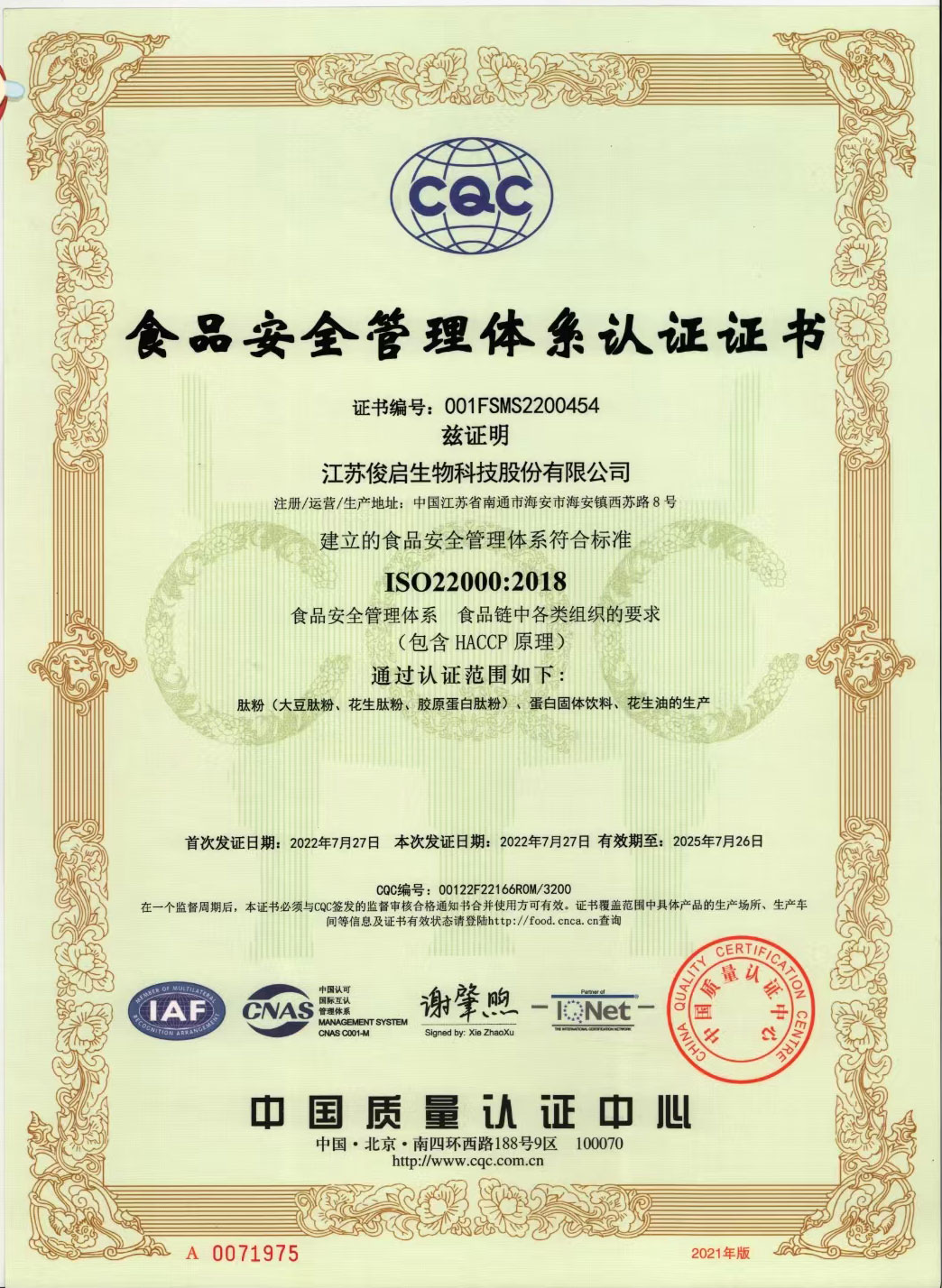 2022年7月27日,我司獲得了中國(guó)質(zhì)量認(rèn)證中心(CQC)食品安全管理(ISO22000)體系認(rèn)證證書,這一榮譽(yù)的獲得,標(biāo)志著我司已建立了完善的食品安全管理體系,食品安全管理能力符合國(guó)家標(biāo)準(zhǔn)要求,進(jìn)一步了提升公司的影響力,使公司邁上一個(gè)嶄新的、更加寬廣的發(fā)展平臺(tái)。
